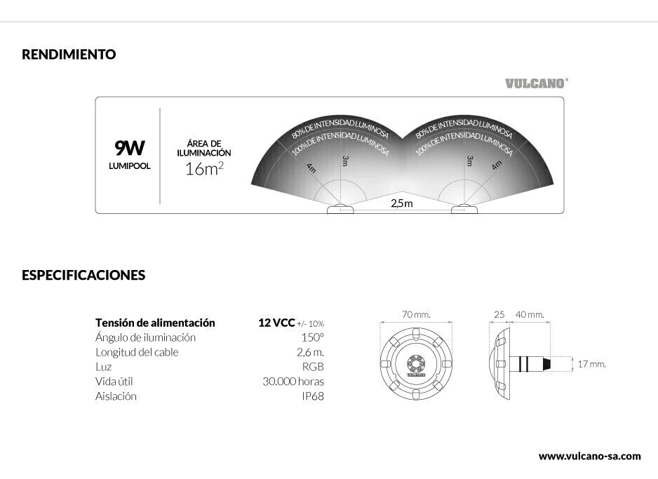 Luminaria subacuática LUMIPOOL Vulcano 9W de luz blanca 12 VCC. Con ángulo de apertura de 170°, brinda excelente potencia de iluminación con niveles muy bajos de consumo energético. Esta luz, fabricada completamente en policarbonato led, es compacta y de fácil instalación.